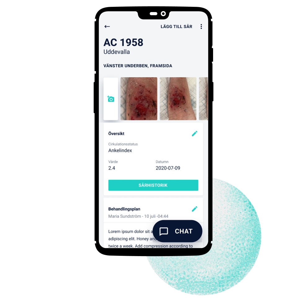 Følg utviklingen av såret ved å ta et bilde ved hvert sårskift direkte i appen. Bildene i pasientprofilen gir deg en rask oversikt over sårets utvikling og du kan enkelt legge til flere sår under samme pasientprofil.