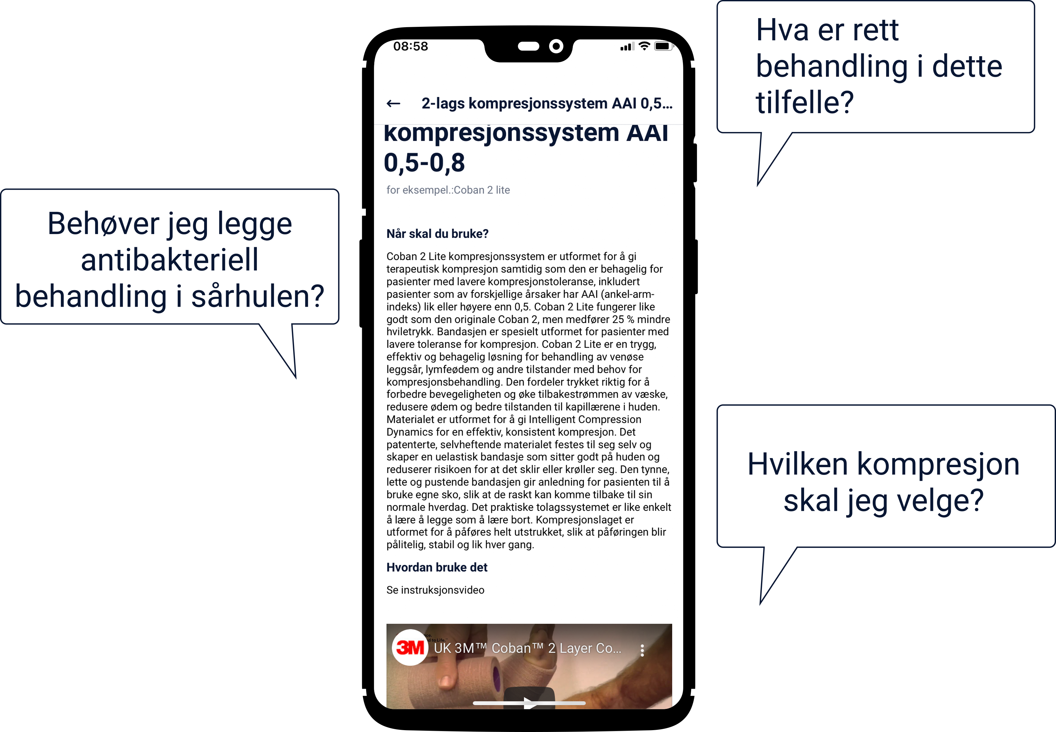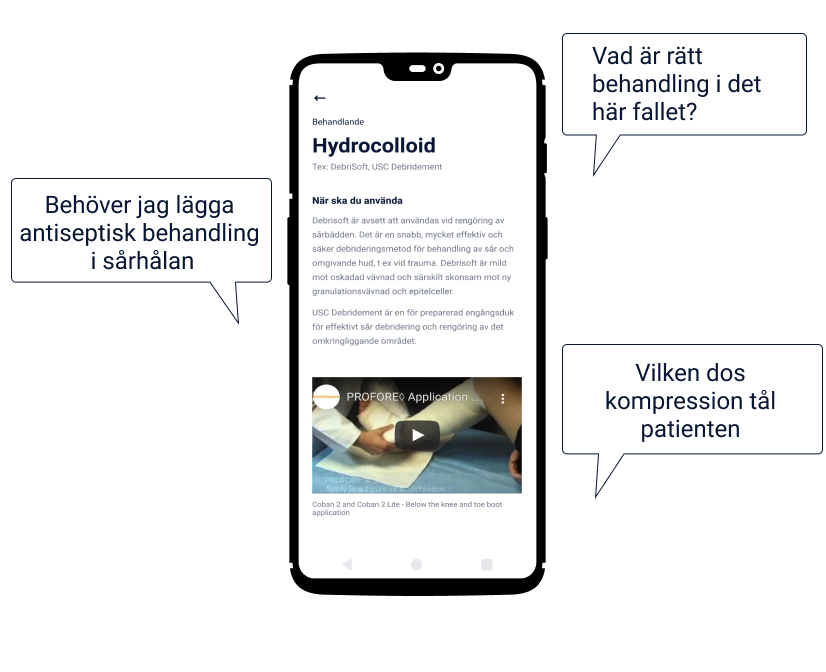 Ved å få støtte og råd fra sårspesialist, om adekvat behandling og enkelt kunne følge utviklingen av sårbehandlingen, kan vi sammen oppnå en raskere sårtilheling.Appen inneholder et omfattende materialbibliotek med informasjon og instruksjonsvideoer.