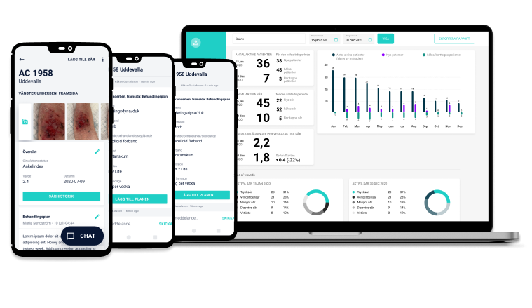 Dashbord bidrar også til at du kan følge antall sår, skiftfrekvenser og se sårdiagnosene, noe som gjør det enkelt å se effekten av programmet.